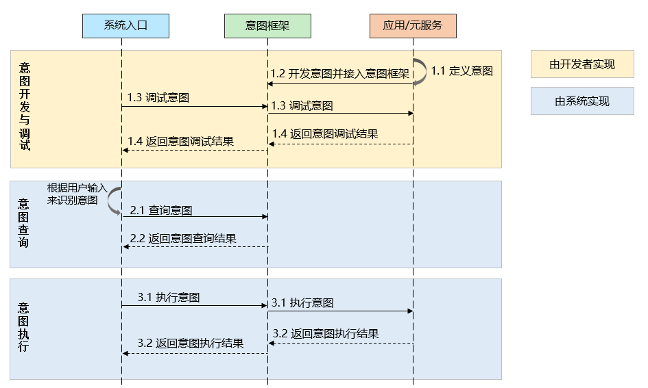 - 意图执行:系统入口根据用户请求匹配到相应意图后,触发该意图的执行,并将必要的参数传递给应用。应用执行对应功能并返回执行结果。