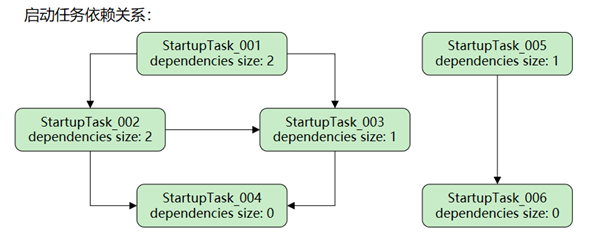假设当前应用启动框架共包含6个启动任务,任务之间的依赖关系如下图所示。为了便于并发执行启动任务,单个启动任务文件包含的启动任务应尽量单一,本例中每个启动任务对应一个启动任务文件。