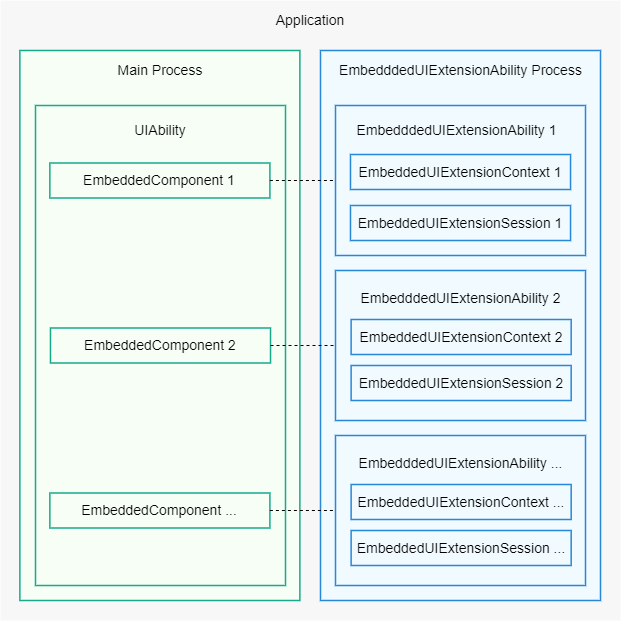 EmbeddedUIExtensionAbility需要和EmbeddedComponent一起配合使用,开发者可以在UIAbility的页面中通过EmbeddedComponent嵌入本应用的EmbeddedUIExtensionAbility提供的UI。EmbeddedUIExtensionAbility在独立进程中运行,完成其页面的布局和渲染,与UIAbility数据不互通,适用于有进程隔离诉求的模块化开发场景。