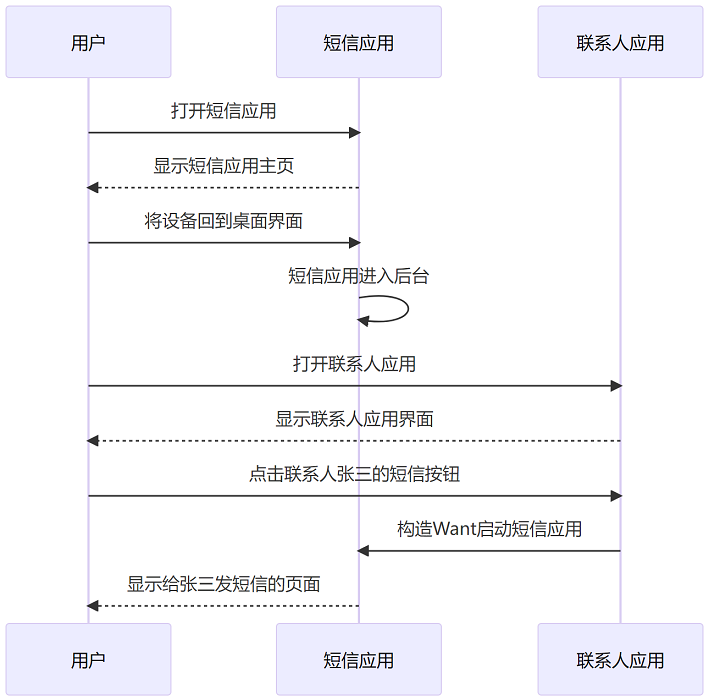 - 用户点击联系人张三的短信按钮,会再次启动短信应用的UIAbility实例。