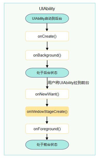 - 当用户将UIAbility拉到前台,系统会依次触发onNewWant()、onWindowStageCreate()、onForeground()生命周期回调。