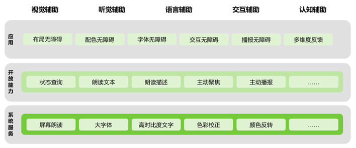- 开放能力: 基于系统服务,为应用提供了无障碍开放能力,如屏幕朗读开启状态的查询,无障碍朗读文本的设置、主动播报等。