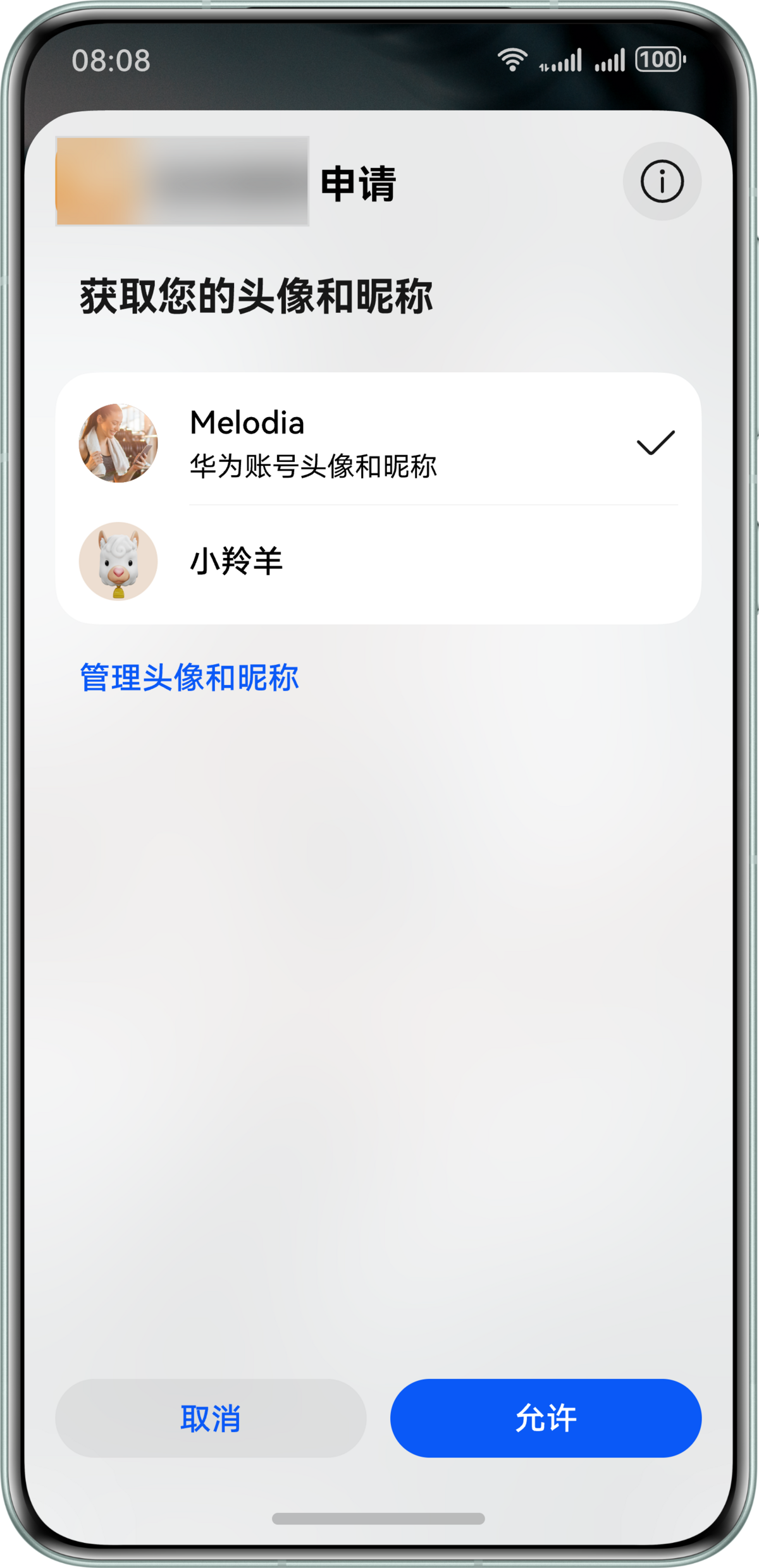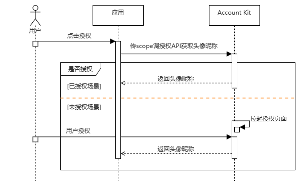 当应用需要获取用户头像昵称信息,可使用Account Kit提供的头像昵称授权能力,用户允许应用获取头像昵称后,可快速完成个人信息填写。以下对Account Kit提供的头像昵称授权能力进行介绍。此外,开发者也可通过场景化控件中的选择头像Button获取用户头像。