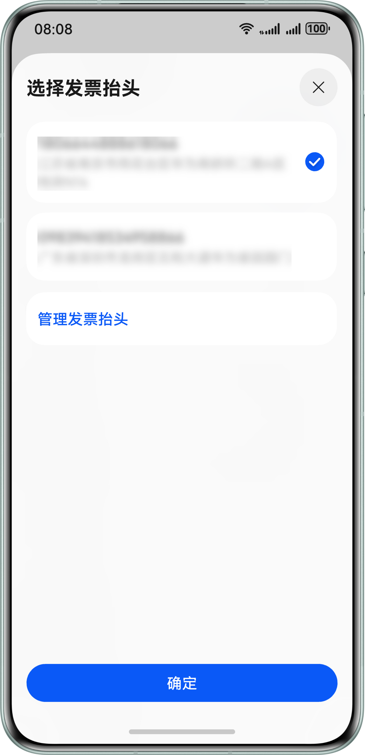 - 用户可以在发票抬头选择页选择已有发票抬头或者跳转到发票抬头管理页进行增加,点击确认后可将选择的发票抬头返回给应用。