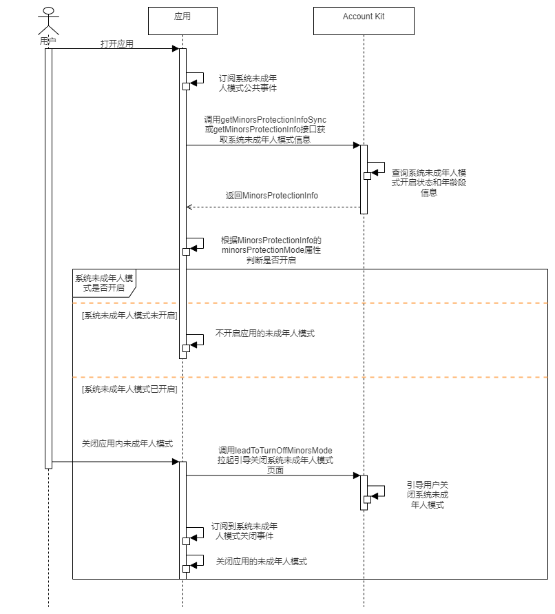 - 用户打开应用时,应用通过订阅系统未成年人模式公共事件感知未成年人模式的状态变化。可以调用getMinorsProtectionInfoSync或getMinorsProtectionInfo获取系统未成年人模式信息。