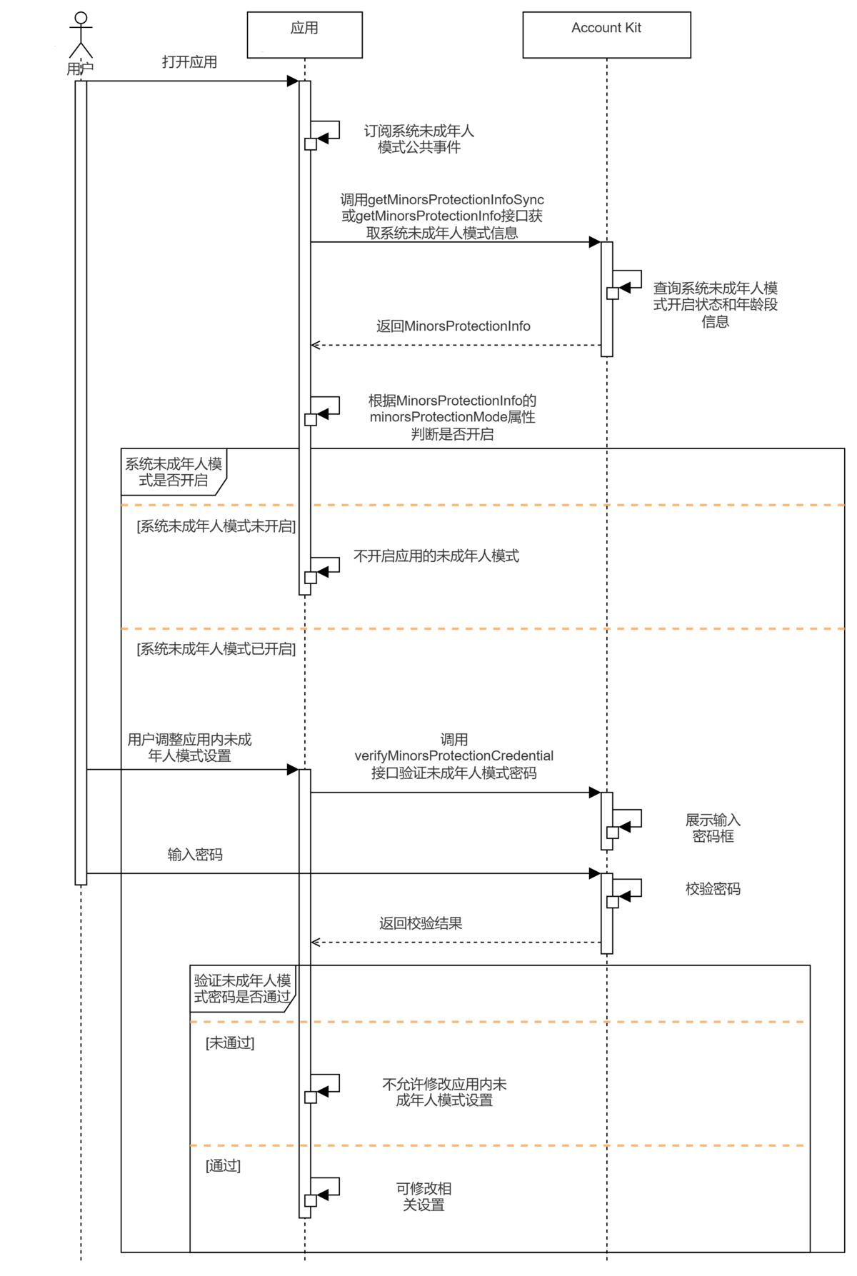 - 用户打开应用时,应用通过系统未成年人模式公共事件感知未成年人模式的状态变化。可以调用getMinorsProtectionInfoSync或getMinorsProtectionInfo获取系统未成年人模式信息。