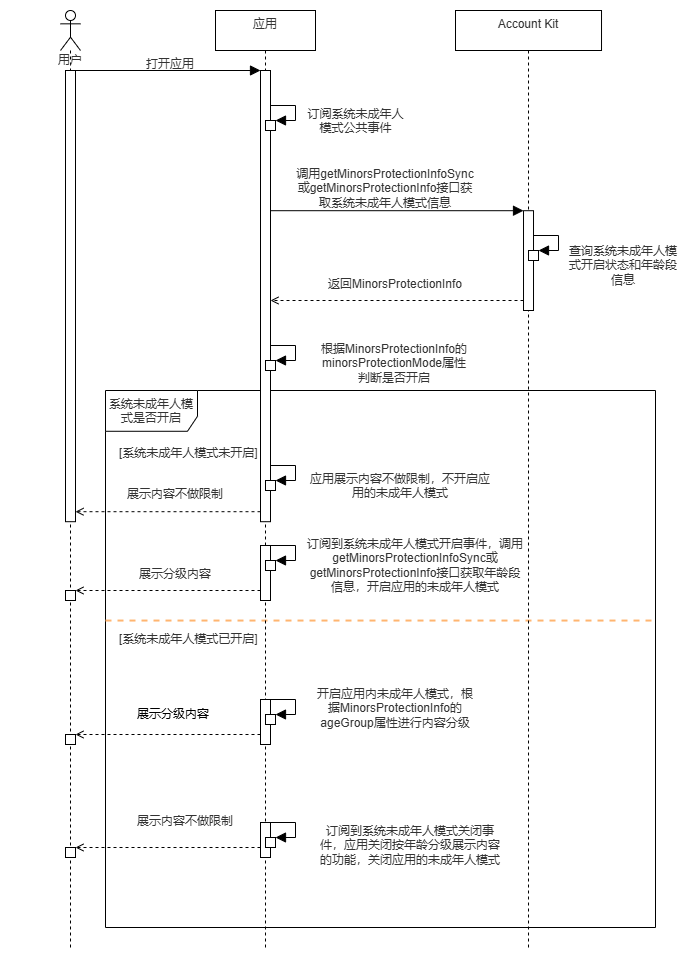 - 查询系统的未成年人模式是否开启:应用启动时,可调用getMinorsProtectionInfoSync接口,主动查询系统的未成年人模式状态;如系统未成年人模式为开启状态,则应自动开启应用的未成年人模式;如系统未成年人模式为关闭状态,则应自动关闭应用的未成年人模式。