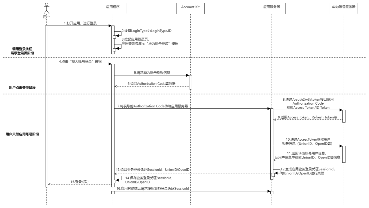 - 应用服务端将业务登录凭证SessionId、UnionID/OpenID传给应用,应用获取到UnionID/OpenID可用于判断华为账号是否登录等功能。