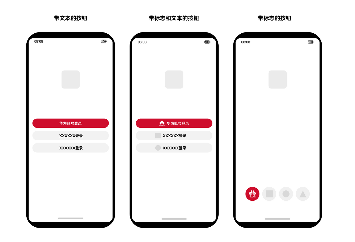 华为账号登录按钮包含文本、标志和文本、标志三种样式,以满足应用对界面风格一致性和灵活性的要求。