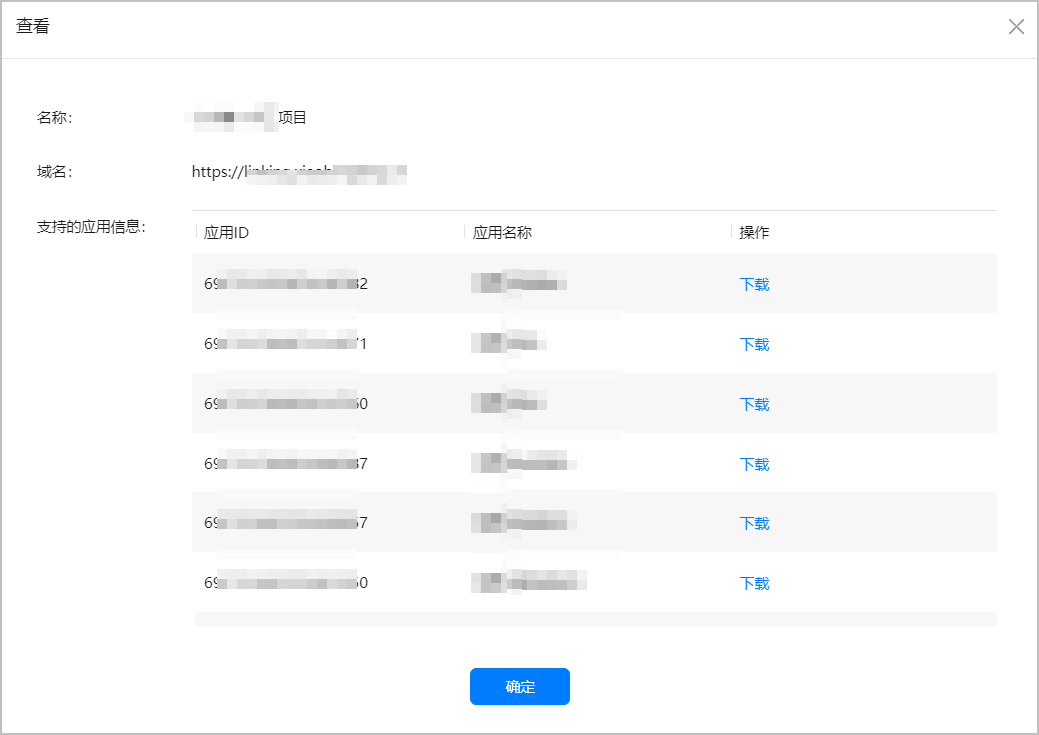 如果域名的配置文件中存在本项目中的应用,则发布成功,点击“查看”可显示该域名关联的应用信息。