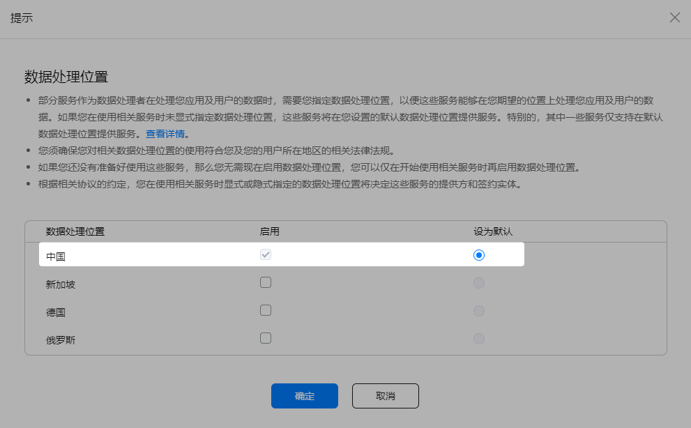 如果项目此时未设置数据处理位置,请在提示框内启用数据处理位置和设置默认数据处理位置,点击“确定”。