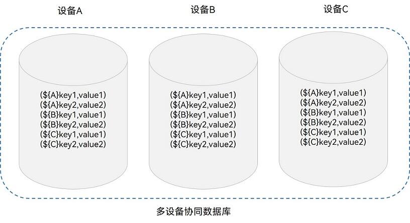 多设备协同分布式数据库建立在单版本数据库之上,对应用程序存入的键值型数据中的Key前面拼接了本设备的DeviceID标识符,这样能保证每个设备产生的数据严格隔离。数据以设备的维度管理,不存在冲突;支持按照设备的维度查询数据。