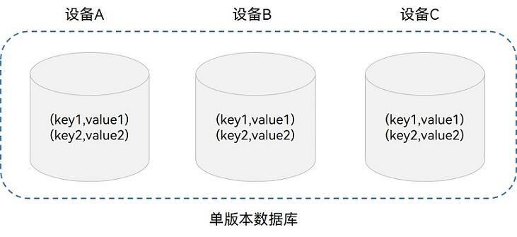 单版本是指数据在本地是以单个条目为单位的方式保存,当用户修改时,直接在这个条目上进行修改。在数据端端同步后多个设备全局只保留一份数据,多个设备的相同记录(主码相同)会按时间最新保留一条记录,数据不分设备,设备之间修改相同的key会覆盖。端端同步也以此为基础,按照它在本地被写入或更改的顺序将当前最新一次修改逐条同步至远端设备,常用于联系人、天气等应用存储场景。