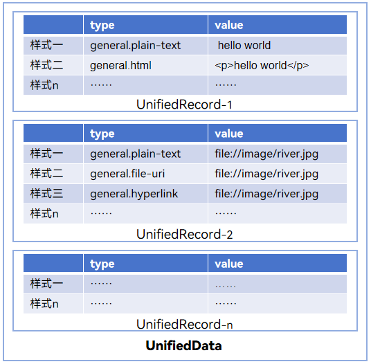 在上图中,不同的UnifiedRecord表示不同的记录,不同记录之间承载的内容是不一致的;在同一个UnifiedRecord中,同一内容以不同的样式存储,丰富了数据的表现形式。