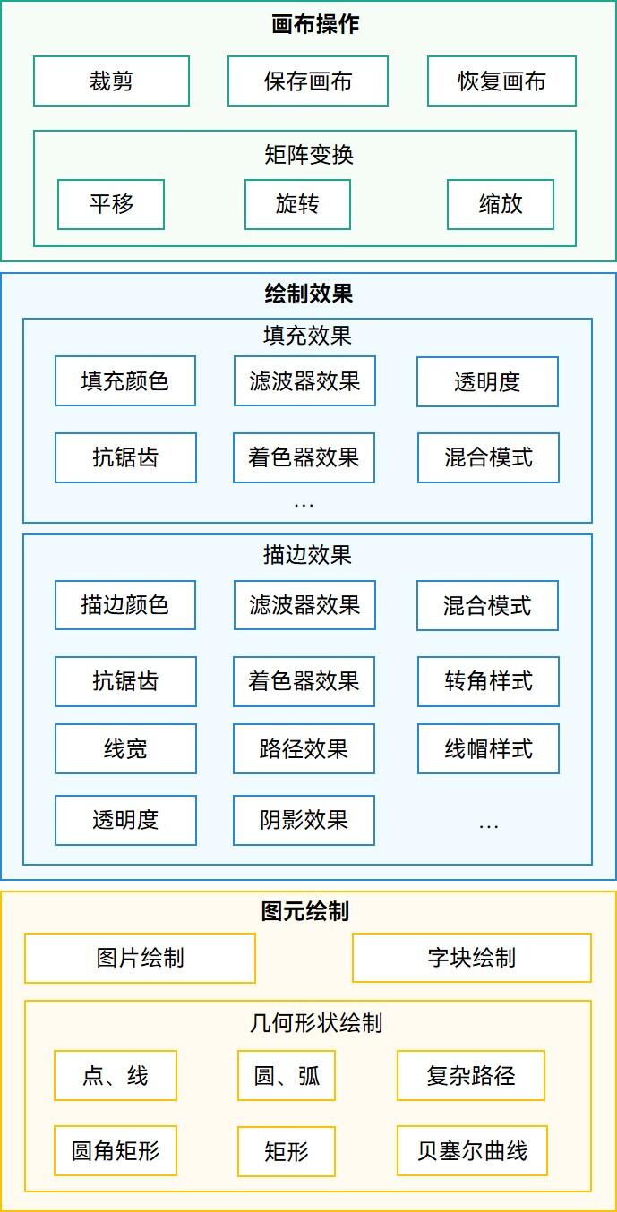 ArkGraphics 2D基于2D图像渲染引擎为开发者提供了一系列灵活多样的图形绘制接口。主要分为画布操作、绘制效果、图元绘制几方面,各部分支持能力关键列举如上图所示,后续可能支持更多相关能力,此处不再一一呈现,具体可关注对应API参考文档。