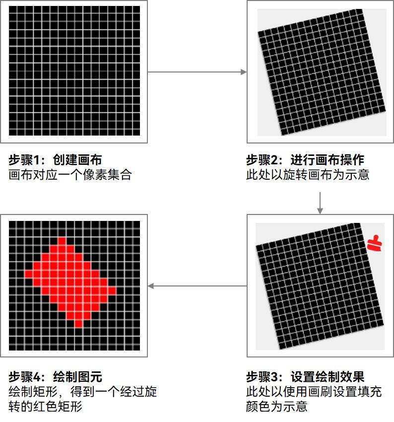 2D图形绘制过程和实际作画的过程是相似的,上图即以绘制经过旋转的红色填充矩形为例,提供了图形绘制的流程。主要实现流程和步骤如下:
