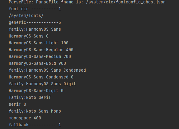以下打印的示例为应用设备系统对应的部分系统字体配置信息情况,不同设备系统配置信息可能不同,此处仅示意。