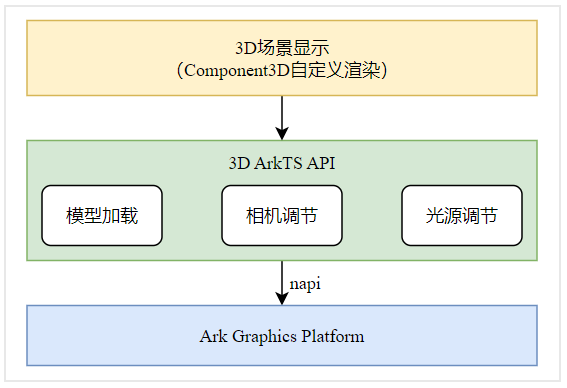 模型加载后,可以通过ArkUI的Component3D渲染组件呈现给用户,Component3D负责将ArkGraphics 3D场景渲染到界面中。在自定义场景模式下,开发者可以使用ArkTS API创建并管理相机和光源节点,从而设置合适的观察角度和光照效果;在自动场景模式下,框架会根据模型自动创建基础相机和光照。ArkTS API可通过napi调用AGP中由C++实现的相应能力。