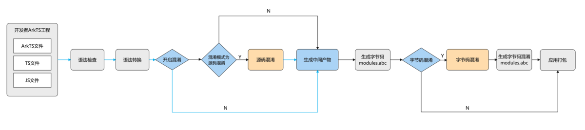 混淆过程中,首先读取混淆开关。在开关开启的情况下,解析混淆配置文件,并依据混淆规则合并策略合并混淆规则。然后按照混淆规则对生成的abc文件进行字节码混淆,最后将混淆后的中间文件落盘至build目录。开发者可以通过build目录中混淆后的产物,确认混淆效果。