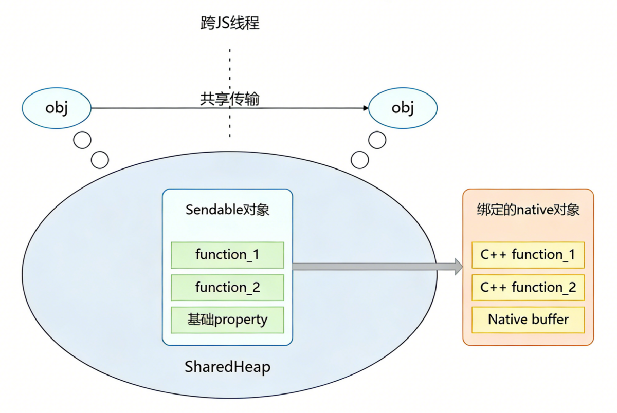 Sendable对象可共享,跨线程前后指向同一个JS对象。如果Sendable对象通过调用Napi接口与一个Native对象绑定,当共享传递Sendable对象时,其绑定的Native对象也会一并共享传递。通信过程如下图所示: