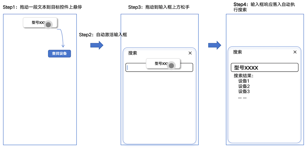 为了简化示例,准备一个可拖出文字的组件以供用户拖出待搜索的文字,并添加一个按钮控件,用于响应Spring Loading来进一步激活视图。被激活的视图通过bindSheet实现,内部配置有一个输入框控件用于接收拖拽文本,以及一个文本组件用于展示搜索结果。