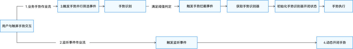 - 监听手势作业流:指在监听手势运行的过程中,应根据上下文的业务状态变化动态控制手势识别器的开闭,例如判断组件嵌套滚动过程中是否已滑至边缘。这一监听事件可借助一个使用并行手势绑定方式的PanGesture实现,或者采用Touch事件来完成。