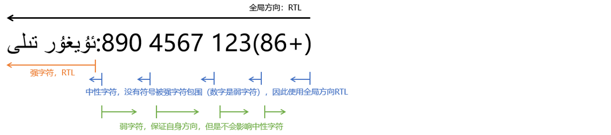 - 强字符的方向性:强字符具有明确的方向性,例如,中文为LTR,阿拉伯语为RTL,这类字符的方向性会影响其周围的中性字符。