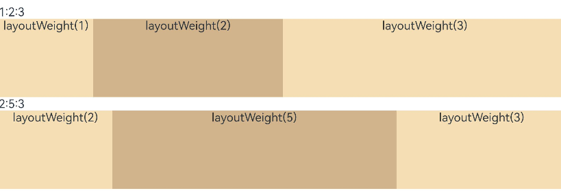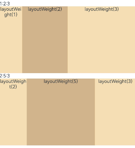 @Entry@Componentstruct LayoutWeightExample {build() {Column() {Text('1:2:3').width('100%')Row() {Column() {Text('layoutWeight(1)').textAlign(TextAlign.Center)}.layoutWeight(1).backgroundColor(0xF5DEB3).height('100%')Column() {Text('layoutWeight(2)').textAlign(TextAlign.Center)}.layoutWeight(2).backgroundColor(0xD2B48C).height('100%')Column() {Text('layoutWeight(3)').textAlign(TextAlign.Center)}.layoutWeight(3).backgroundColor(0xF5DEB3).height('100%')}.backgroundColor(0xffd306).height('30%')Text('2:5:3').width('100%')Row() {Column() {Text('layoutWeight(2)').textAlign(TextAlign.Center)}.layoutWeight(2).backgroundColor(0xF5DEB3).height('100%')Column() {Text('layoutWeight(5)').textAlign(TextAlign.Center)}.layoutWeight(5).backgroundColor(0xD2B48C).height('100%')Column() {Text('layoutWeight(3)').textAlign(TextAlign.Center)}.layoutWeight(3).backgroundColor(0xF5DEB3).height('100%')}.backgroundColor(0xffd306).height('30%')}}}图11 横屏