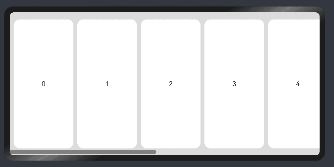 @Entry@Componentstruct ScrollHorizontalExample {scroller: Scroller = new Scroller();private arr: number[] = [0, 1, 2, 3, 4, 5, 6, 7, 8, 9];build() {Scroll(this.scroller) {Row() {ForEach(this.arr, (item?:number|undefined) => {if(item != undefined){Text(item.toString()).height('90%').width(150).backgroundColor(0xFFFFFF).borderRadius(15).fontSize(16).textAlign(TextAlign.Center).margin({ left: 10 })}})}.height('100%')}.backgroundColor(0xDCDCDC).scrollable(ScrollDirection.Horizontal) // 滚动方向为水平方向.scrollBar(BarState.On) // 滚动条常驻显示.scrollBarColor(Color.Gray) // 滚动条颜色.scrollBarWidth(10) // 滚动条宽度.edgeEffect(EdgeEffect.Spring) // 滚动到边沿后回弹}}