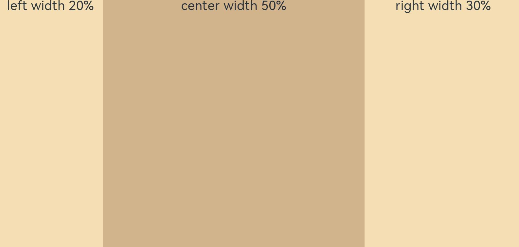 Row({}) {Column() {}.width('20%').height(30).backgroundColor(0xF5DEB3)Column() {}.width('20%').height(30).backgroundColor(0xD2B48C)Column() {}.width('20%').height(30).backgroundColor(0xF5DEB3)}.width('100%').height(200).backgroundColor('rgb(242,242,242)').justifyContent(FlexAlign.Start) -