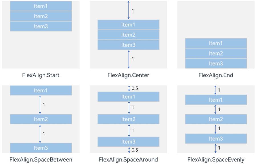 justifyContent(FlexAlign.SpaceAround):垂直方向均匀分配元素,相邻元素之间距离相同。第一个元素到行首的距离和最后一个元素到行尾的距离是相邻元素之间距离的一半。