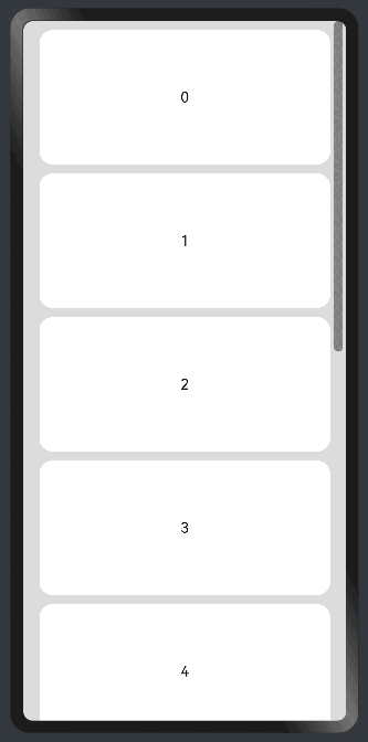 @Entry@Componentstruct ScrollVerticalExample {scroller: Scroller = new Scroller();private arr: number[] = [0, 1, 2, 3, 4, 5, 6, 7, 8, 9];build() {Scroll(this.scroller) {Column() {ForEach(this.arr, (item?:number|undefined) => {if(item != undefined){Text(item.toString()).width('90%').height(150).backgroundColor(0xFFFFFF).borderRadius(15).fontSize(16).textAlign(TextAlign.Center).margin({ top: 10 })}}, (item:number) => item.toString())}.width('100%')}.backgroundColor(0xDCDCDC).scrollable(ScrollDirection.Vertical) // 滚动方向为垂直方向.scrollBar(BarState.On) // 滚动条常驻显示.scrollBarColor(Color.Gray) // 滚动条颜色.scrollBarWidth(10) // 滚动条宽度.edgeEffect(EdgeEffect.Spring) // 滚动到边沿后回弹}}