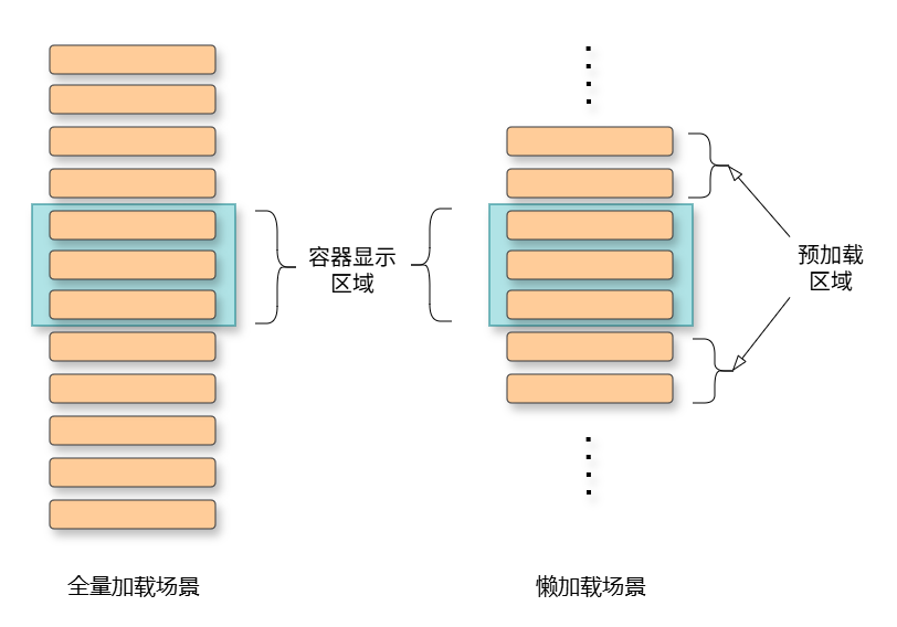 相比之下,懒加载场景只加载“列表显示区域+预加载区域”的子组件节点。滚动容器组件获取需要构建的组件的索引范围,创建需要的节点并计算布局,在列表滑动或数据更新时再次刷新索引范围。首次加载性能提升,滑动时创建节点,性能降低。