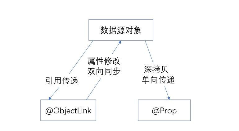 - @ObjectLink装饰的变量和数据源的关系是双向同步,@ObjectLink装饰的变量相当于指向数据源的指针。禁止对@ObjectLink装饰的变量赋值,如果发生@ObjectLink装饰的变量的赋值,则同步链将被打断。