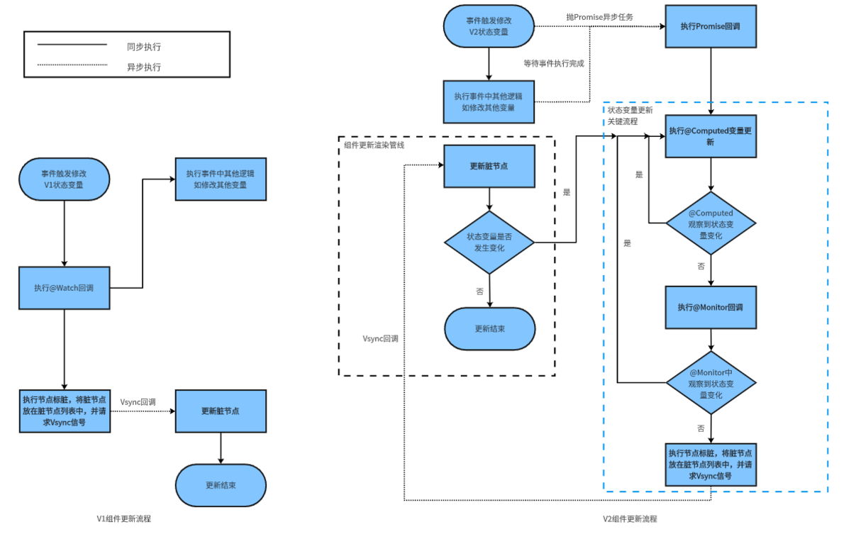 如下图所示,展示V1组件和V2状态变量更新差异的流程图,相比V1状态管理,V2状态管理在状态变量变化时,会异步标脏组件。