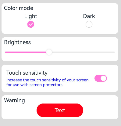 // Index.etsimport { Theme, ThemeControl } from '@kit.ArkUI';import { gAppTheme } from './AppTheme';//在页面build前执行ThemeControlThemeControl.setDefaultTheme(gAppTheme);@Entry@Componentstruct DisplayPage {@State menuItemColor: ResourceColor = $r('sys.color.background_primary');onWillApplyTheme(theme: Theme) {this.menuItemColor = theme.colors.backgroundPrimary;}build() {Column() {List({ space: 10 }) {ListItem() {Column({ space: '5vp' }) {Text('Color mode').margin({ top: '5vp', left: '14fp' }).width('100%')Row() {Column() {Text('Light').fontSize('16fp').textAlign(TextAlign.Start).alignSelf(ItemAlign.Center)Radio({ group: 'light or dark', value: 'light' }).checked(true)}.width('50%')Column() {Text('Dark').fontSize('16fp').textAlign(TextAlign.Start).alignSelf(ItemAlign.Center)Radio({ group: 'light or dark', value: 'dark' })}.width('50%')}}.width('100%').height('90vp').borderRadius('10vp').backgroundColor(this.menuItemColor)}ListItem() {Column() {Text('Brightness').width('100%').margin({ top: '5vp', left: '14fp' })Slider({ value: 40, max: 100 })}.width('100%').height('70vp').borderRadius('10vp').backgroundColor(this.menuItemColor)}ListItem() {Column() {Row() {Column({ space: '5vp' }) {Text('Touch sensitivity').fontSize('16fp').textAlign(TextAlign.Start).width('100%')Text('Increase the touch sensitivity of your screen' +' for use with screen protectors').fontSize('12fp').fontColor(Color.Blue).textAlign(TextAlign.Start).width('100%')}.alignSelf(ItemAlign.Center).margin({ left: '14fp' }).width('75%')Toggle({ type: ToggleType.Switch, isOn: true }).margin({ right: '14fp' }).alignSelf(ItemAlign.Center)}.width('100%').height('80vp')}.width('100%').borderRadius('10vp').backgroundColor(this.menuItemColor)}ListItem() {Column() {Text('Warning').width('100%').margin({ top: '5vp', left: '14fp' })Button('Text').type(ButtonType.Capsule).role(ButtonRole.ERROR).width('40%')}.width('100%').height('70vp').borderRadius('10vp').backgroundColor(this.menuItemColor)}}}.padding('10vp').backgroundColor('#dcdcdc').width('100%').height('100%')}} -