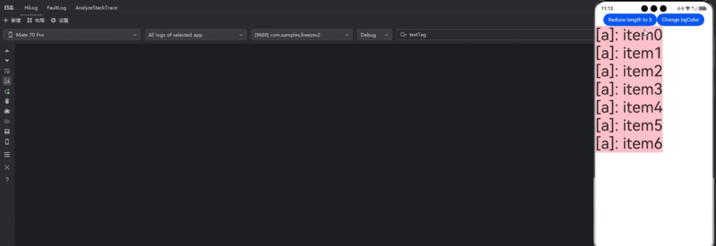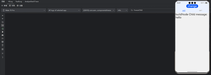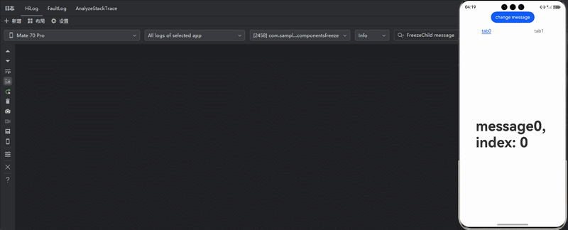 点击change,改变message的值,当前正在显示的TabContent组件中@Monitor注册的方法onMessageChange被触发。未显示的TabContent中的BuilderNode节点下组件的@Monitor方法onMessageChange也被触发,并没有被冻结。