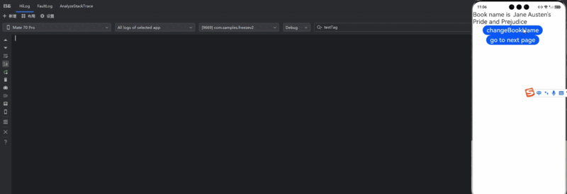 1.在页面1中点击changeBookName,bookTest变量的name属性改变,@Monitor中注册的方法onMessageChange会被调用。