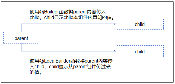 下面示例中,组件Child将状态变量传递到Parent的@Builder和@LocalBuilder函数内。在@Builder函数内,this指向Child,参数变化能触发UI刷新。在@LocalBuilder函数内,this指向Parent,参数变化不会触发UI刷新。若@LocalBuilder函数内引用Parent的状态变量发生变化,UI能正常刷新。
