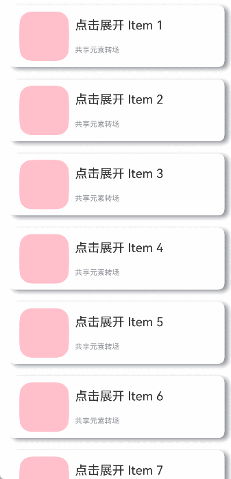 共享元素转场是一种界面切换时对相同或者相似的两个元素做的一种位置和大小匹配的过渡动画效果,也称一镜到底动效。