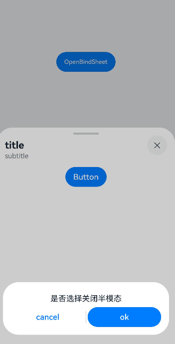 // 第二步:确认二次回调交互能力,此处用AlertDialog提示 "是否需要关闭半模态"