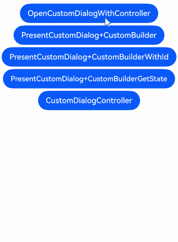 let dialogController: promptAction.CommonController = new promptAction.DialogController();this.getUIContext().getPromptAction().presentCustomDialog(() => {this.customDialogComponent(dialogController);}, dialogController, this.dialogOptions).catch((err: BusinessError) => {hilog.error(0x0000, 'dialogController', 'presentCustomDialog error: ' + err.code + ' ' + err.message);});