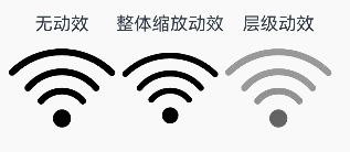 Row() {Column() {// 请将$r('app.string.no_action')替换为实际资源文件,在本示例中该资源文件的value值为"无动效"Text($r('app.string.no_action'));Text() {SymbolSpan($r('sys.symbol.ohos_wifi')).fontSize(96).effectStrategy(SymbolEffectStrategy.NONE)}}Column() {// 请将$r('app.string.overall_scaling_animation_effect')替换为实际资源文件,在本示例中该资源文件的value值为"整体缩放动效"Text($r('app.string.overall_scaling_animation_effect'));Text() {SymbolSpan($r('sys.symbol.ohos_wifi')).fontSize(96).effectStrategy(SymbolEffectStrategy.SCALE)}}Column() {// 请将$r('app.string.hierarchical_animation')替换为实际资源文件,在本示例中该资源文件的value值为"层级动效"Text($r('app.string.hierarchical_animation'));Text() {SymbolSpan($r('sys.symbol.ohos_wifi')).fontSize(96).effectStrategy(SymbolEffectStrategy.HIERARCHICAL)}}}