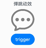 @State triggerValueReplace: number = 0;Column() {// 请将$r('app.string.bounce_animation')替换为实际资源文件,在本示例中该资源文件的value值为"弹跳动效"Text($r('app.string.bounce_animation'));SymbolGlyph($r('sys.symbol.ellipsis_message_1')).fontSize(96).fontColor([Color.Gray]).symbolEffect(new BounceSymbolEffect(EffectScope.WHOLE, EffectDirection.UP),this.triggerValueReplace)Button('trigger').onClick(() => {this.triggerValueReplace = this.triggerValueReplace + 1;})}