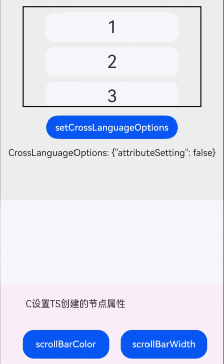 运行程序,在ArkTS侧点击按钮,设置当前attributeSetting为true,在Native侧点击按钮,设置ArkTS侧Scroll组件滚动条的颜色和粗细属性。
