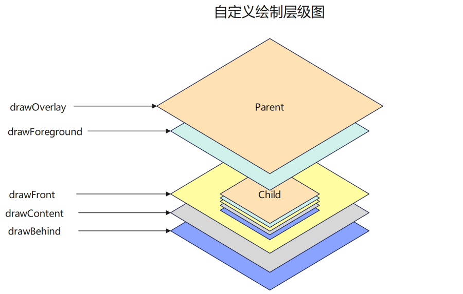 自定义绘制提供了五个绘制层级,从低到高依次为:内容背景层(drawBehind)、内容层(drawContent)、内容前景层(drawFront)、前景层(drawForeground)和浮层(drawOverlay)。开发者可以根据需求选择合适的层级进行绘制。自定义绘制层级图如下所示。