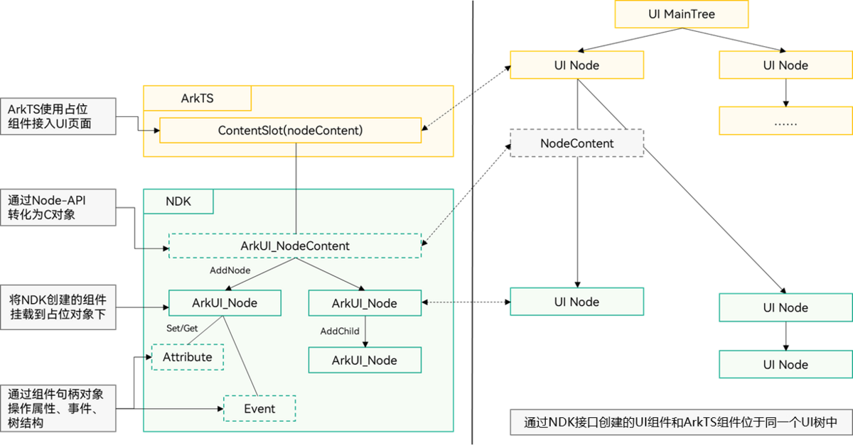 - NDK创建的UI组件需要通过ArkTS层的占位组件进行挂载显示,挂载后,NDK创建的组件和ArkTS创建的组件位于同一个UI树上,相关布局渲染和事件处理遵循相同规则。