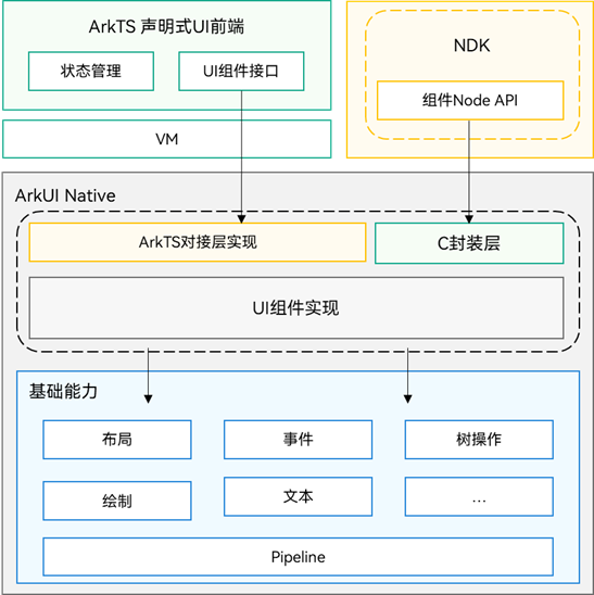 - ArkTS声明式UI前端和NDK接口都是针对ArkUI底层实现的接口暴露,NDK接口相比于ArkTS声明式UI前端,除了剥离状态管理等声明式UI语法外,还精简了组件能力,将ArkUI组件核心功能通过C接口进行封装暴露。