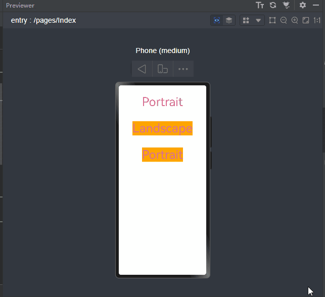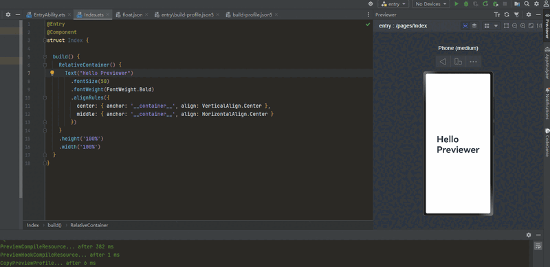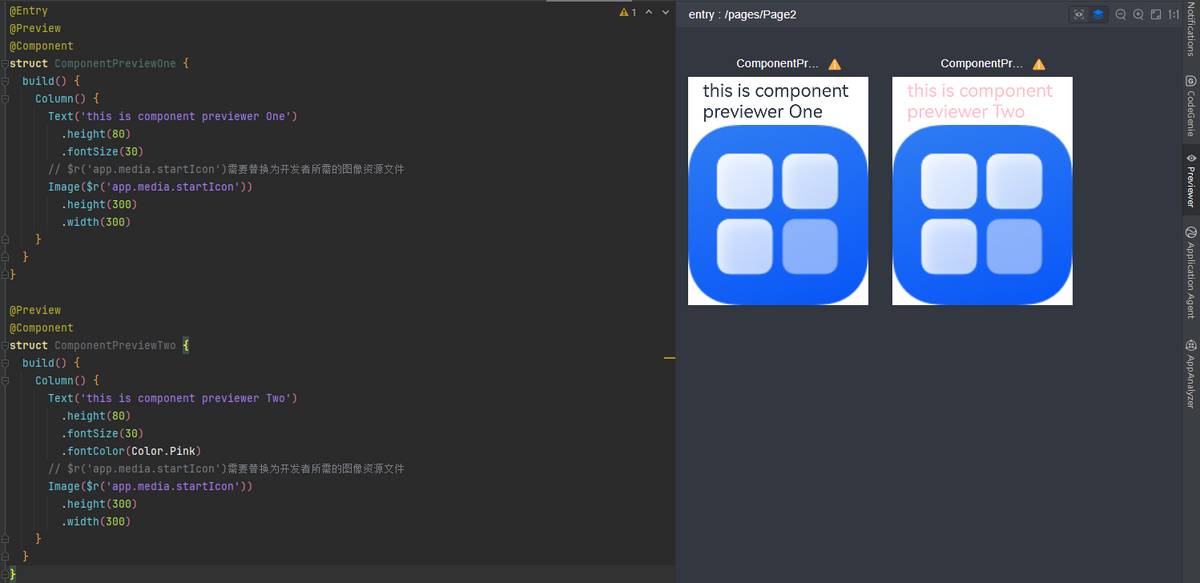 - 当组件仅被@Preview装饰时,点击右侧侧边栏的Previewer按钮,则默认为组件预览。