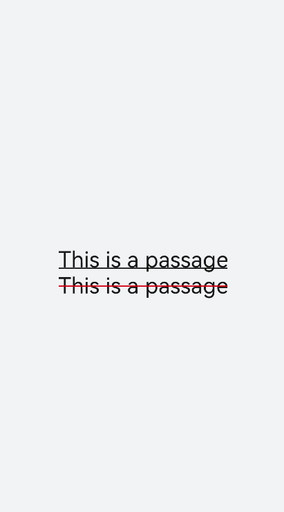 <!-- xxx.hml --><div class="container" style="background-color:#F1F3F5;"><text style="text-decoration:underline">This is a passage</text><text style="text-decoration:line-through;text-decoration-color: red">This is a passage</text></div>/* xxx.css */.container {width: 100%;height: 100%;flex-direction: column;align-items: center;justify-content: center;}text{font-size: 50px;}
